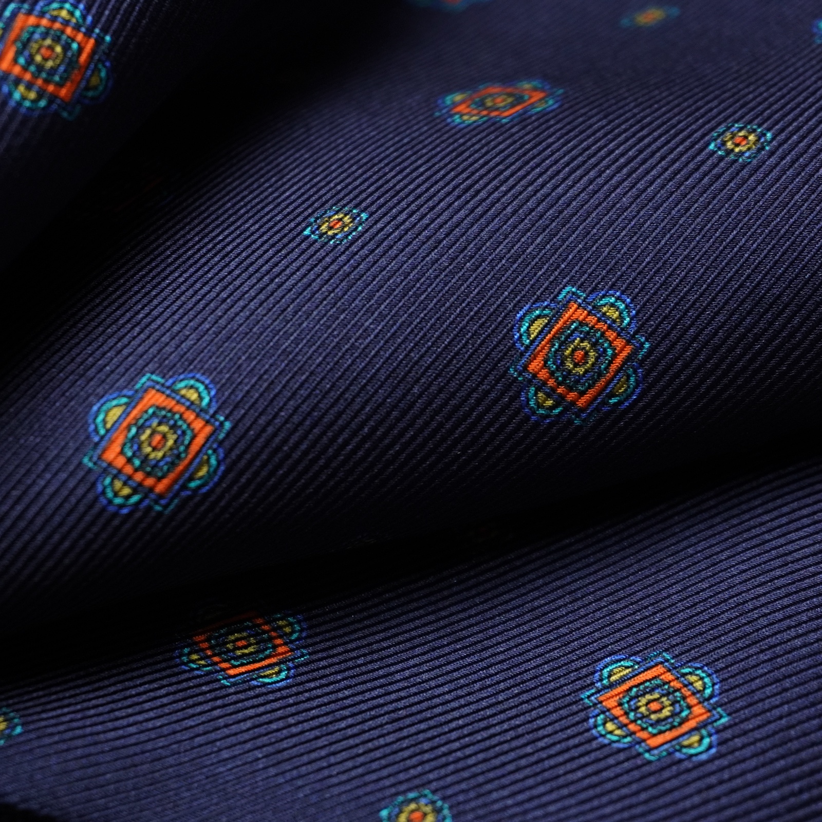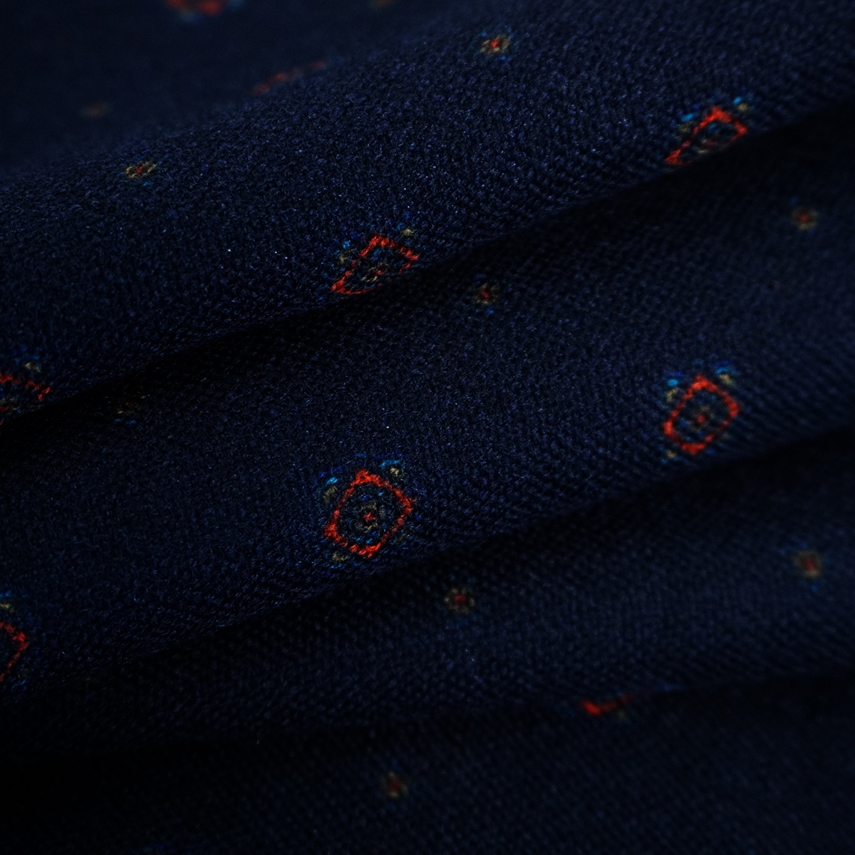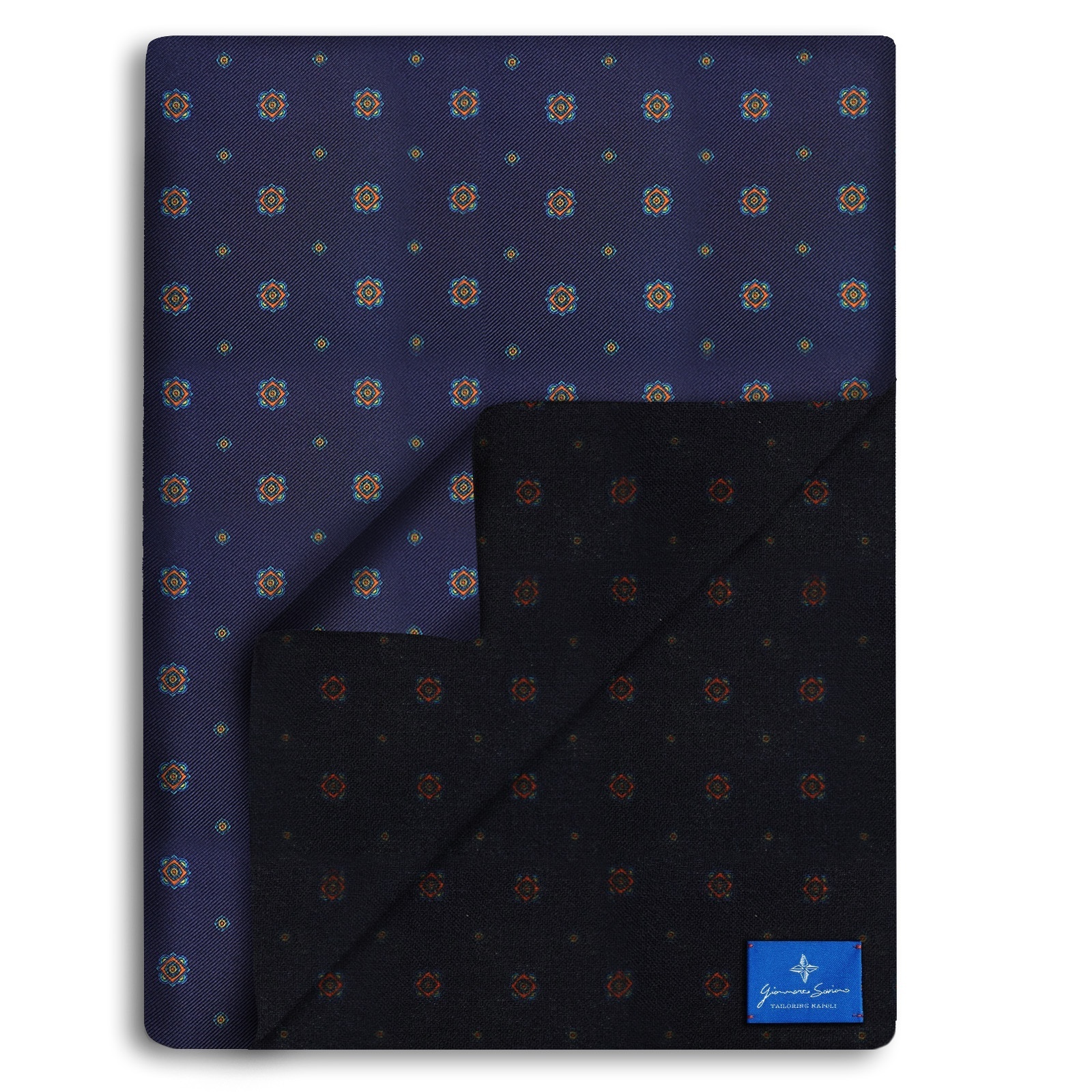 The side on which the pattern is present is made of silk fabric while the side on which there is the monochromatic color with the dark reflections of the pattern is in high quality wool fabric.