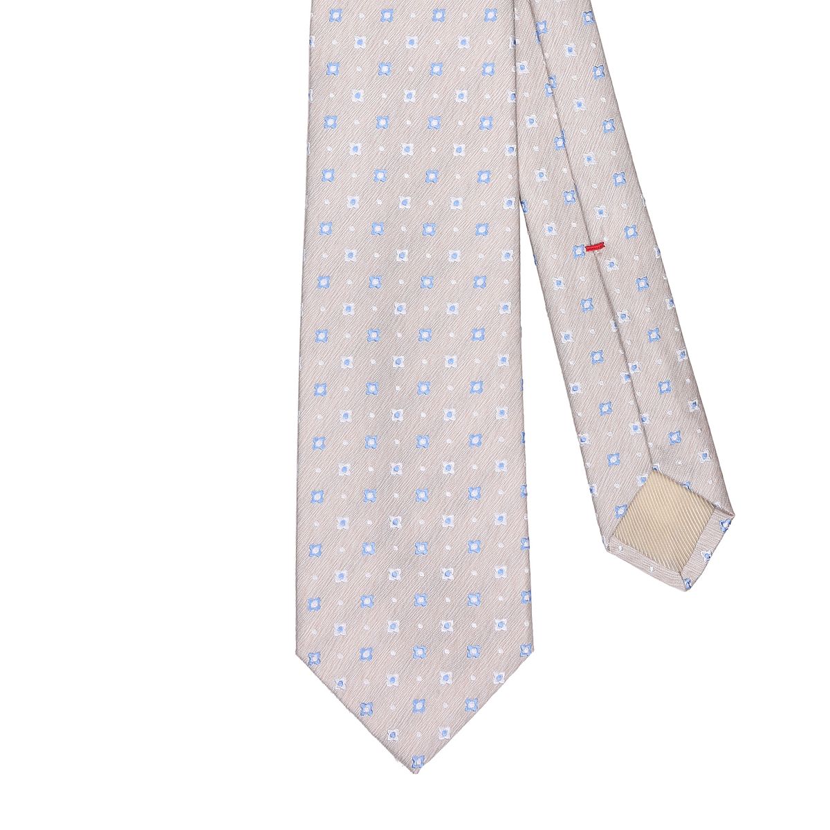 The soul is the fabric placed inside the tie and constitutes its support. The flap consists of a front part, the wider one called the shovel and a rear part called the tail. The lining is instead the rear fabric between the flap and the core. The tie is basted and once sewn, it ends with the flat fell seam, using a silk single sewing thread. This thread is also called SLIP-STITCH, it does not have any knot, starts from the inferior tail and arrives to the anterior shovel. To read the complete handmade process in detail, click here.