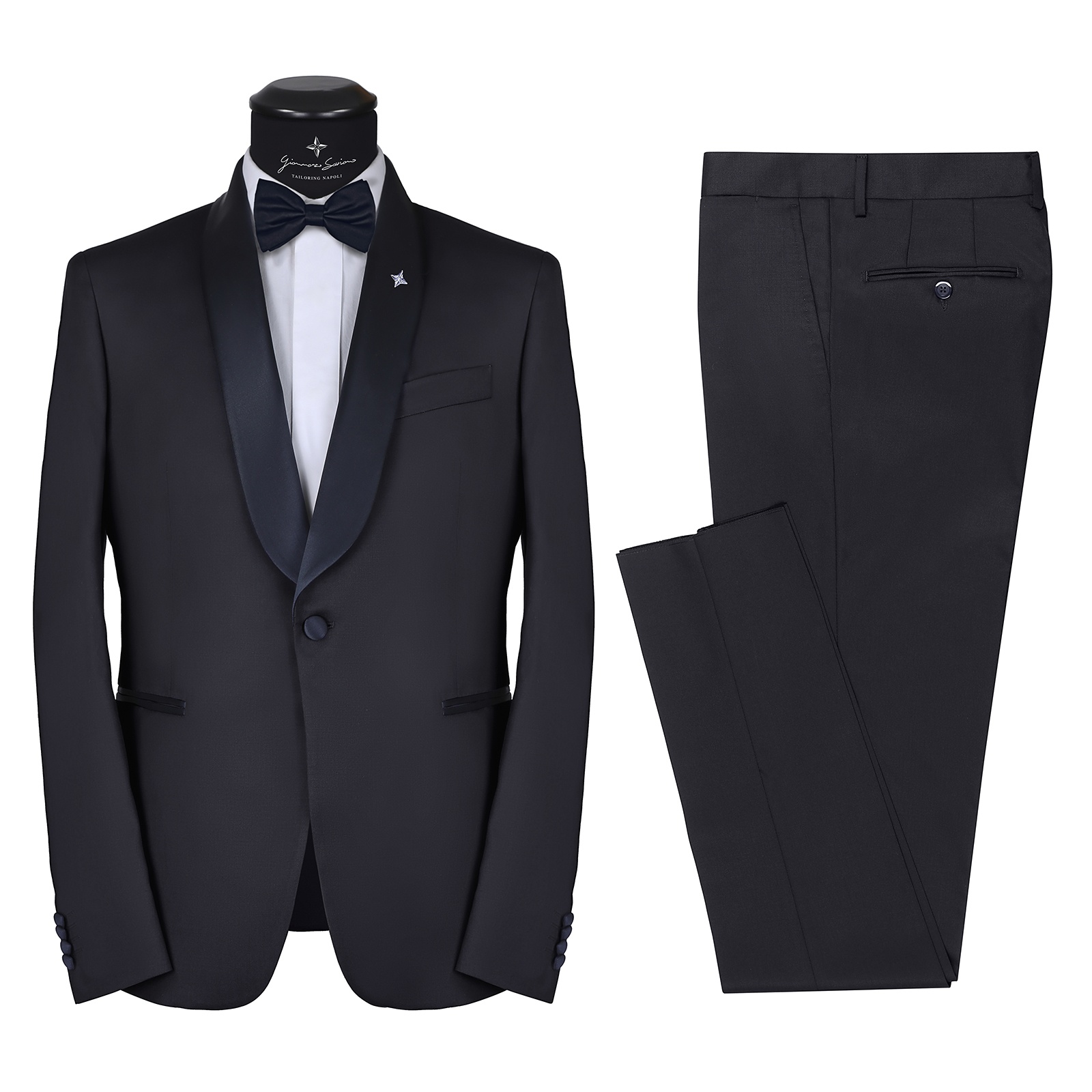 The tuxedo is very elegant as it is made of 1 button covered in wool and silk of the same color as the lapel, on the front there is the black wool and silk shawl lapel with the handcrafted ceramic magnet over it reproducing the brand logo (can be removed ), on the chest there is the small boat pocket typical of the Neapolitan haute couture, on the back 1 slit to give greater compactness.