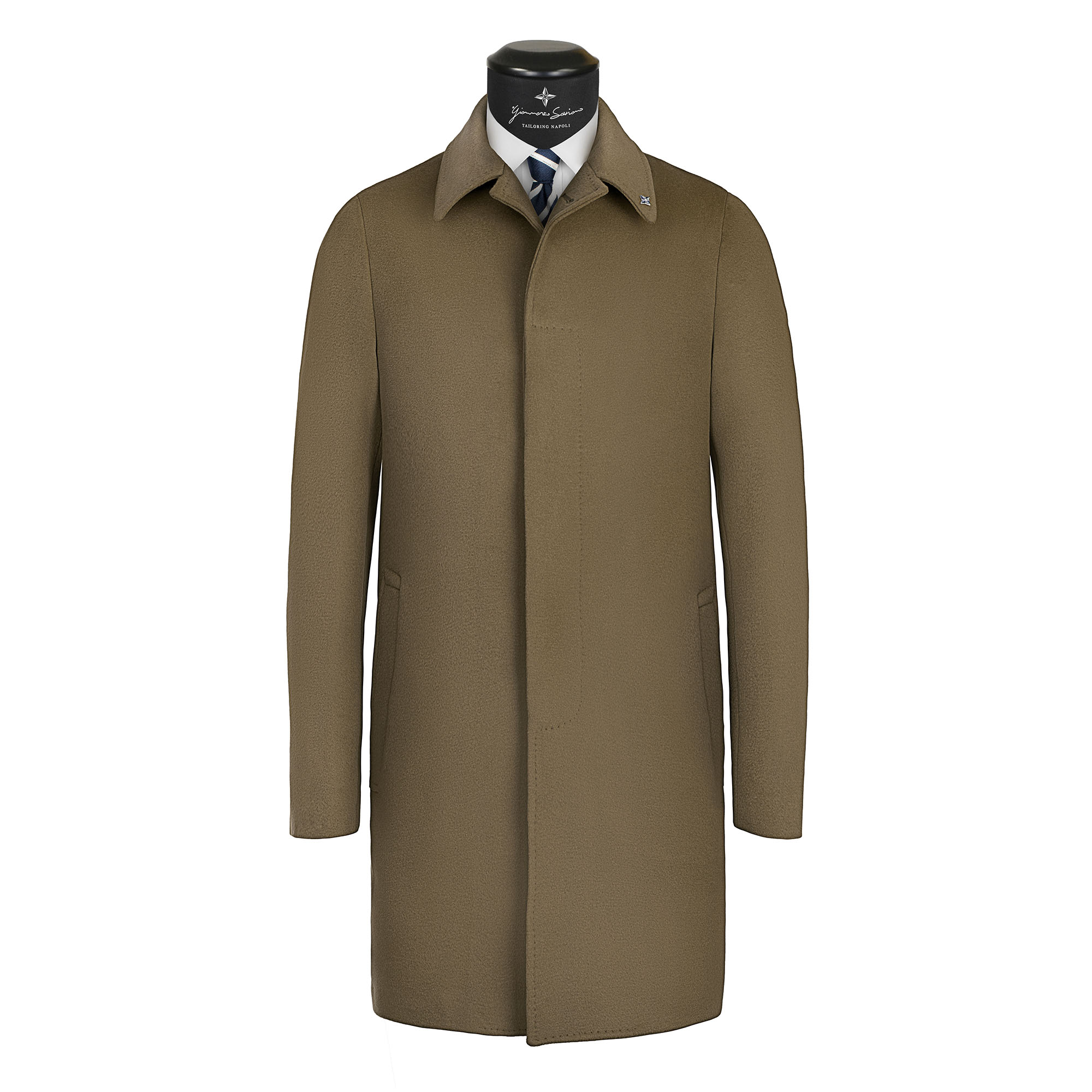 The outerwear is made in the following form: double-breasted with six mother-of-pearl buttons, on the front there is the 12 cm peak lapel with the handcrafted ceramic magnet above the brand logo (can be removed), on the sides there are 2 patch pockets with flap closure, on the chest there is the small boat pocket typical form of Neapolitan haute couture, on the back there is the central slit with martingale, the interior is completely lined in cupro bemberg which guarantees a further touch of quality.