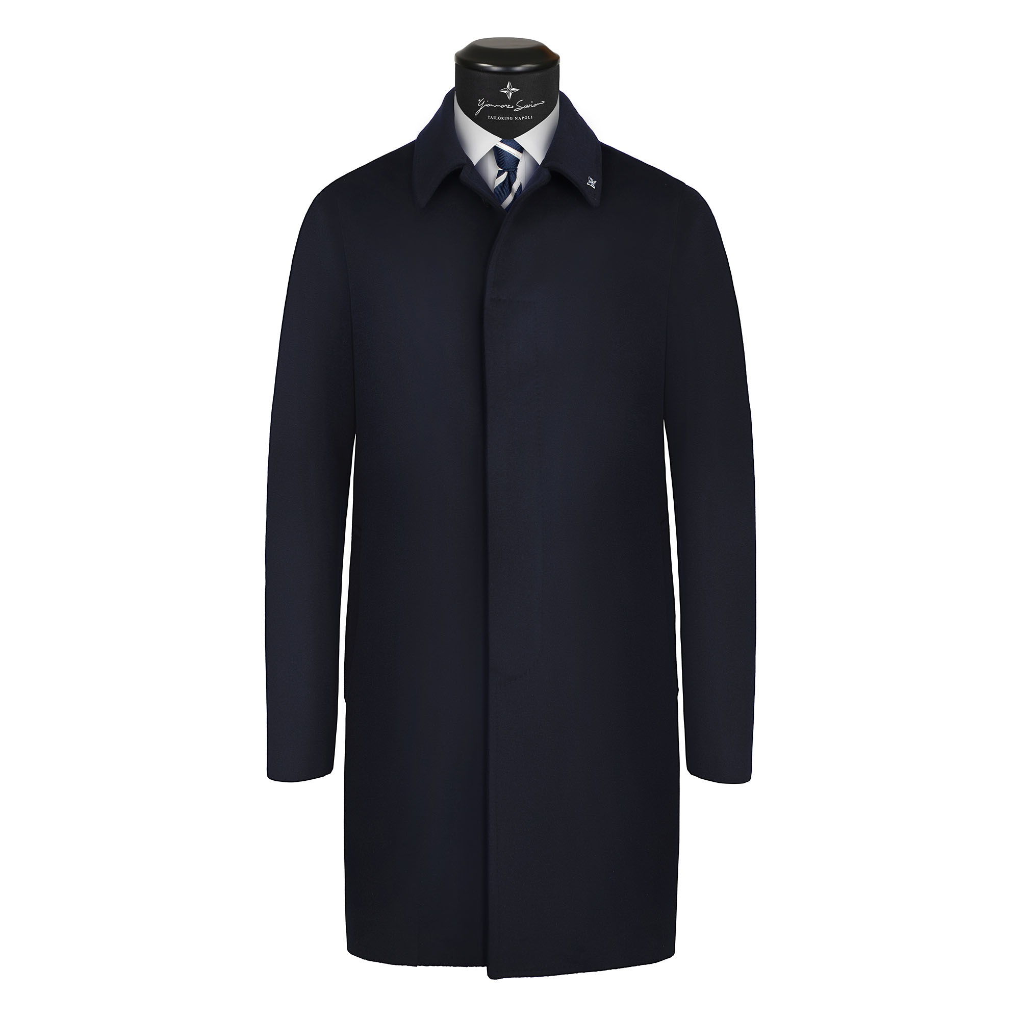 The outerwear is made in the following form: double-breasted with six mother-of-pearl buttons, on the front there is the 12 cm peak lapel with the handcrafted ceramic magnet above the brand logo (can be removed), on the sides there are 2 patch pockets with flap closure, on the chest there is the small boat pocket typical form of Neapolitan haute couture, on the back there is the central slit with martingale, the interior is completely lined in cupro bemberg which guarantees a further touch of quality.