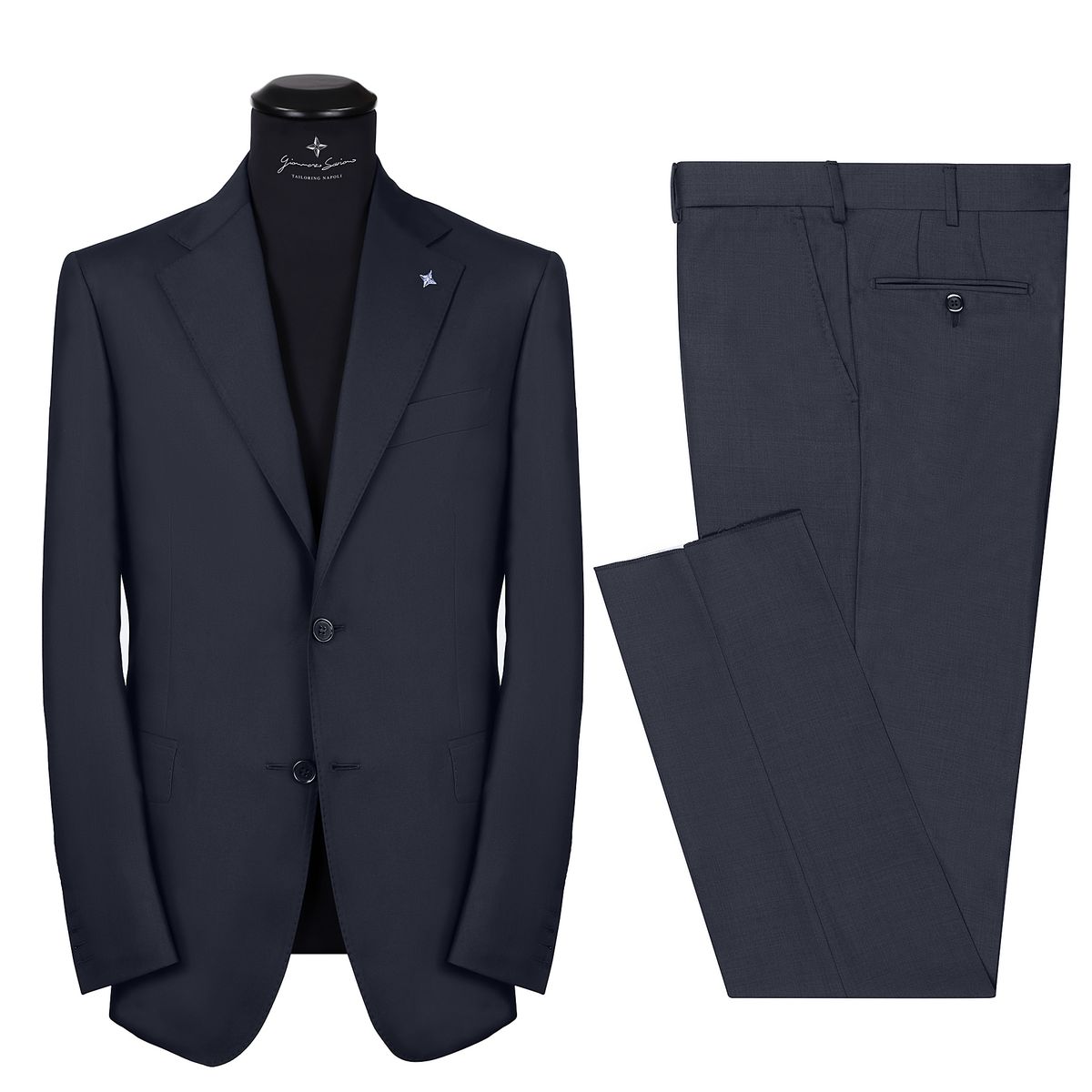 The suit is made of 2 buttons, on the front there is the classic lapel with the handcrafted ceramic magnet over it reproducing the brand logo (it can be removed), on the chest there is the small boat pocket typical of the Neapolitan haute couture, on the back 2 slits for give more convenience.