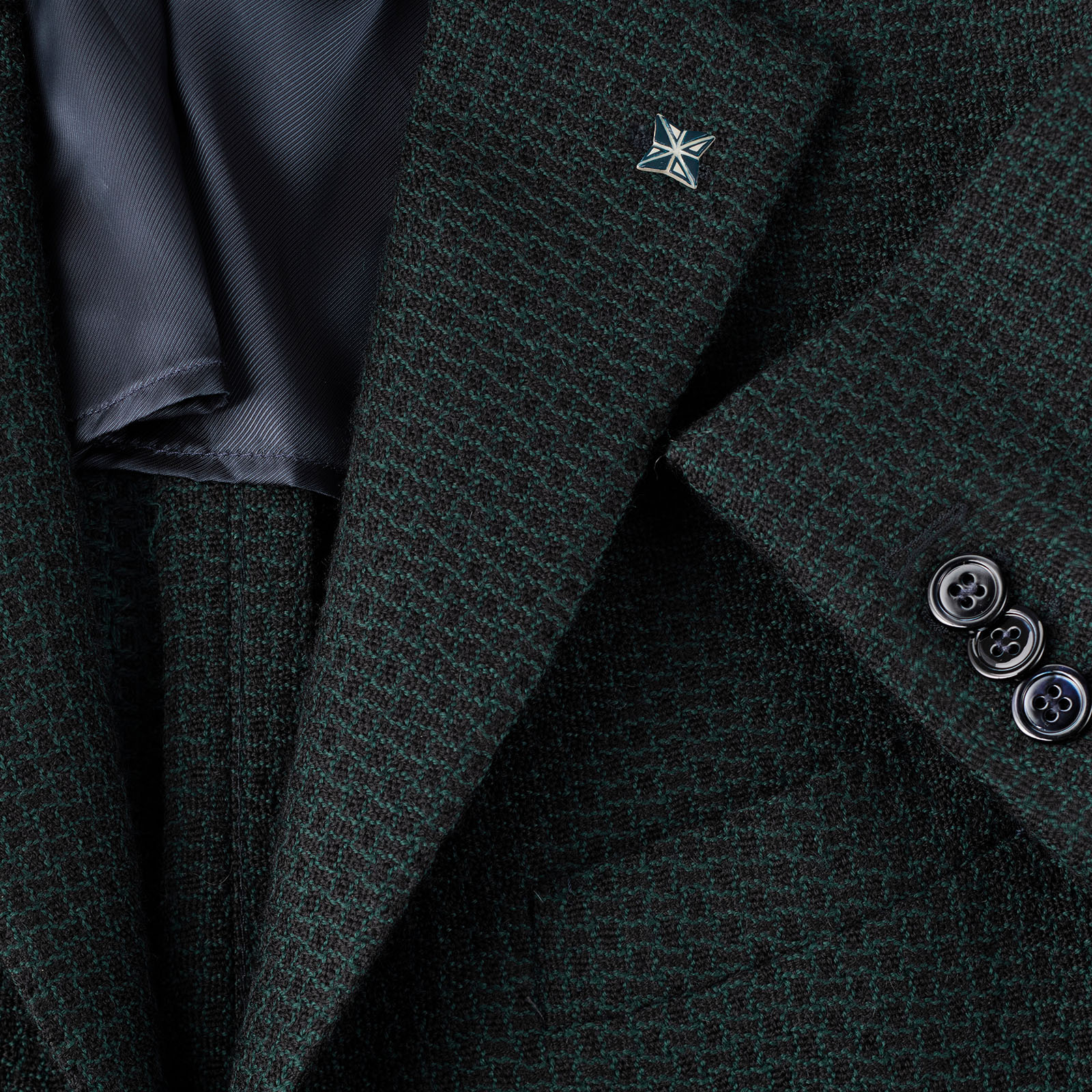 The jacket is made of 2 buttons, on the front there is the classic lapel with above the handcrafted ceramic magnet reproducing the brand logo (possible to remove it), on the chest there is the small boat pocket typical of the Neapolitan haute couture, on the back 2 slits to give greater comfort.