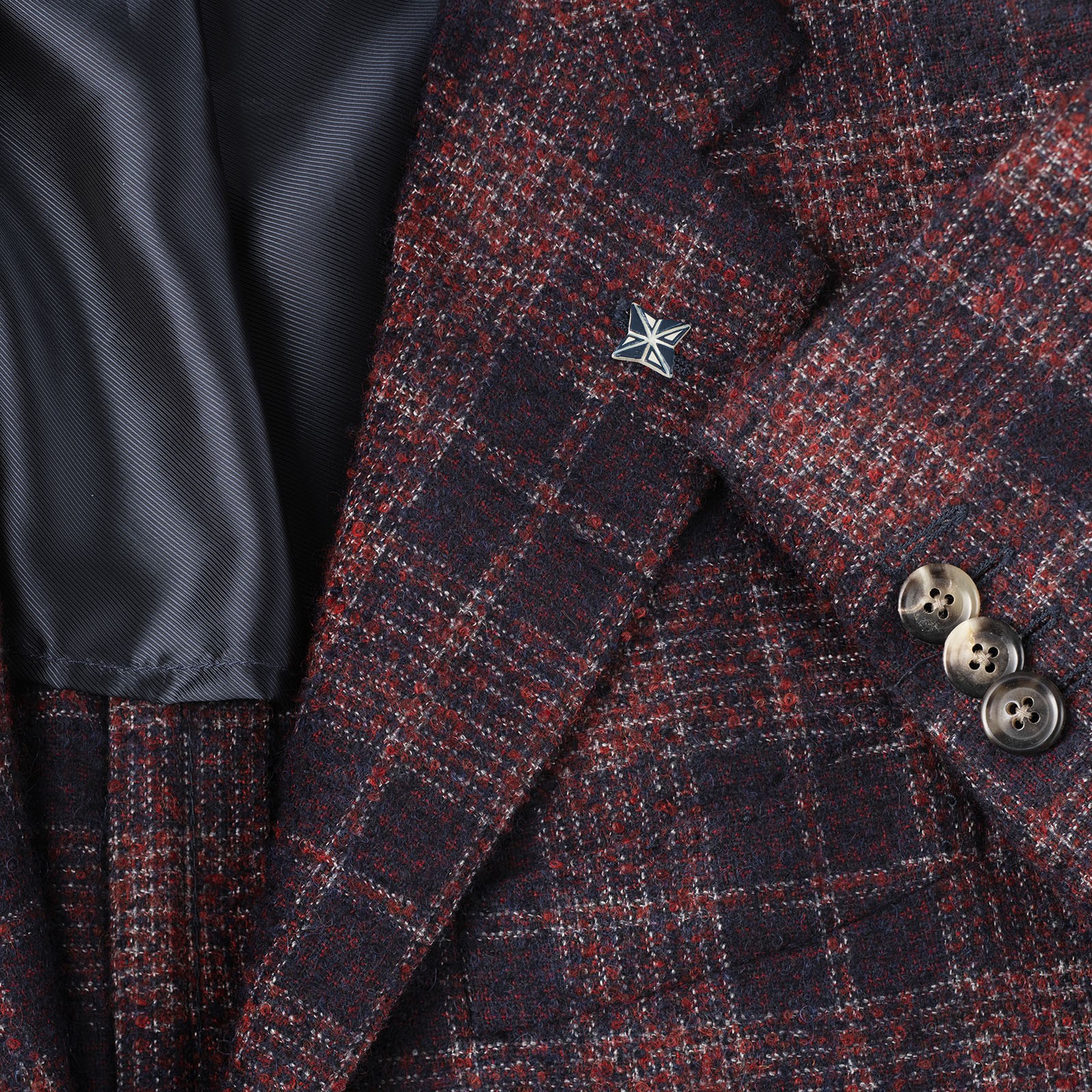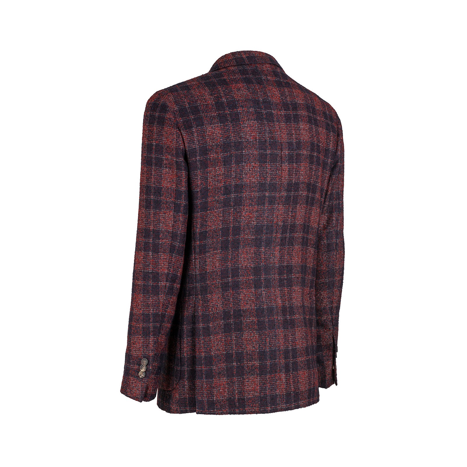 The jacket is made of 2 buttons, on the front there is the classic lapel with above the handcrafted ceramic magnet reproducing the brand logo (possible to remove it), on the chest there is the small boat pocket typical of the Neapolitan haute couture, on the back 2 slits to give greater comfort.
