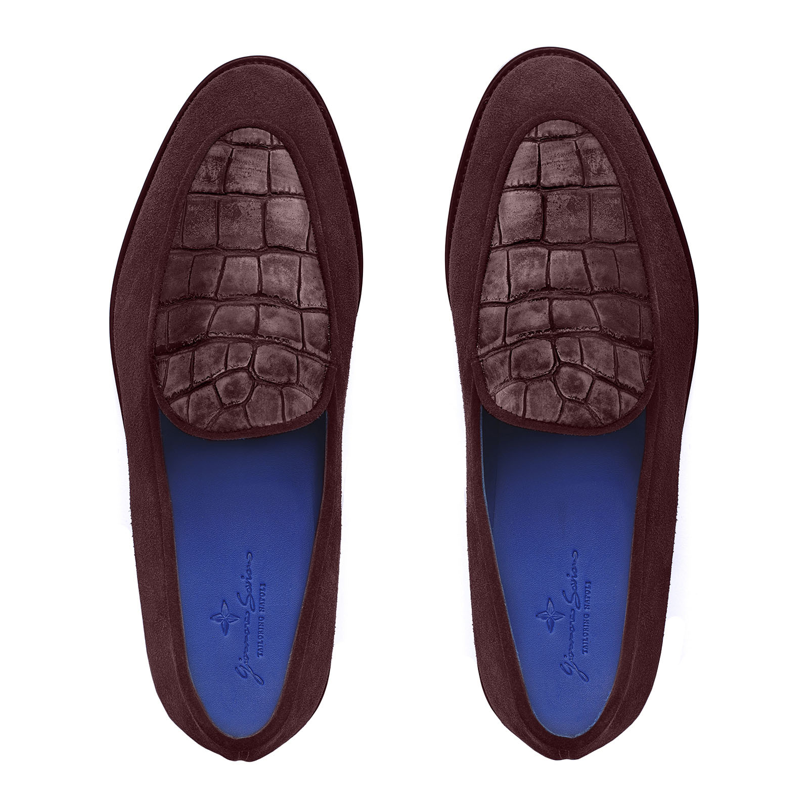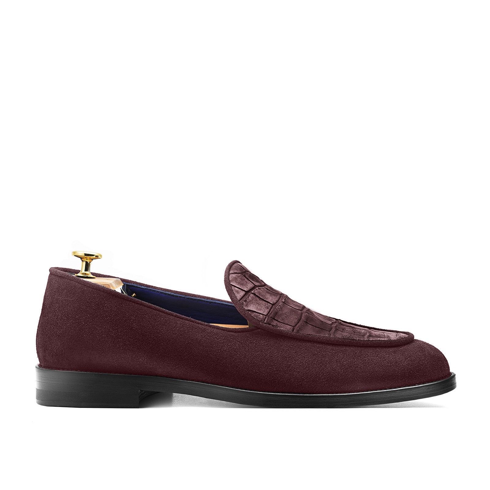 Leather 100% suede bordeaux lower part and Leather 100% worked in crocodile bordeaux upper part – inner lining 100% Goat blue - Manufacturing