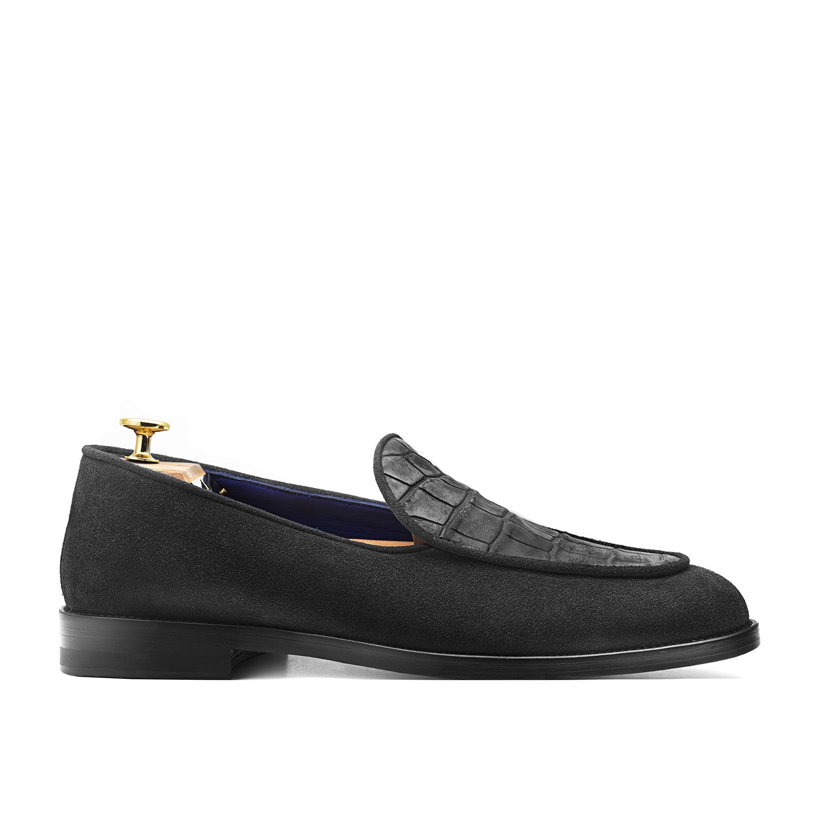 The leathers are: black opaque calfskin with crocodile processing on the top and black suede on the bottom / side.