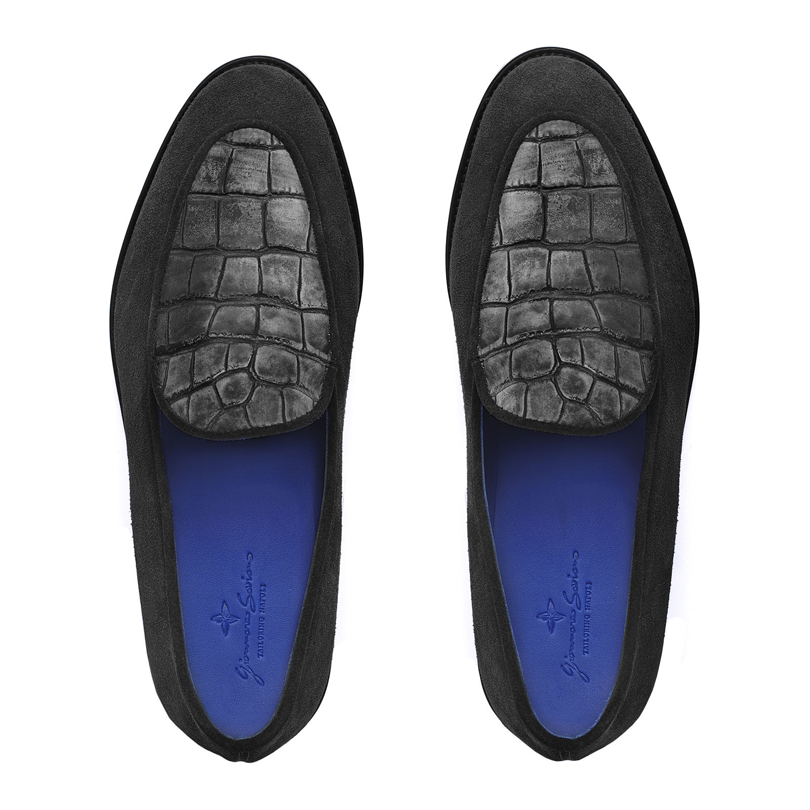 The loafer is made on the upper part with the contrast of crocodile worked leather, the non-slip real leather heel is 3 cm high: height considered ideal by experts for proper walking, the welt also in real leather.