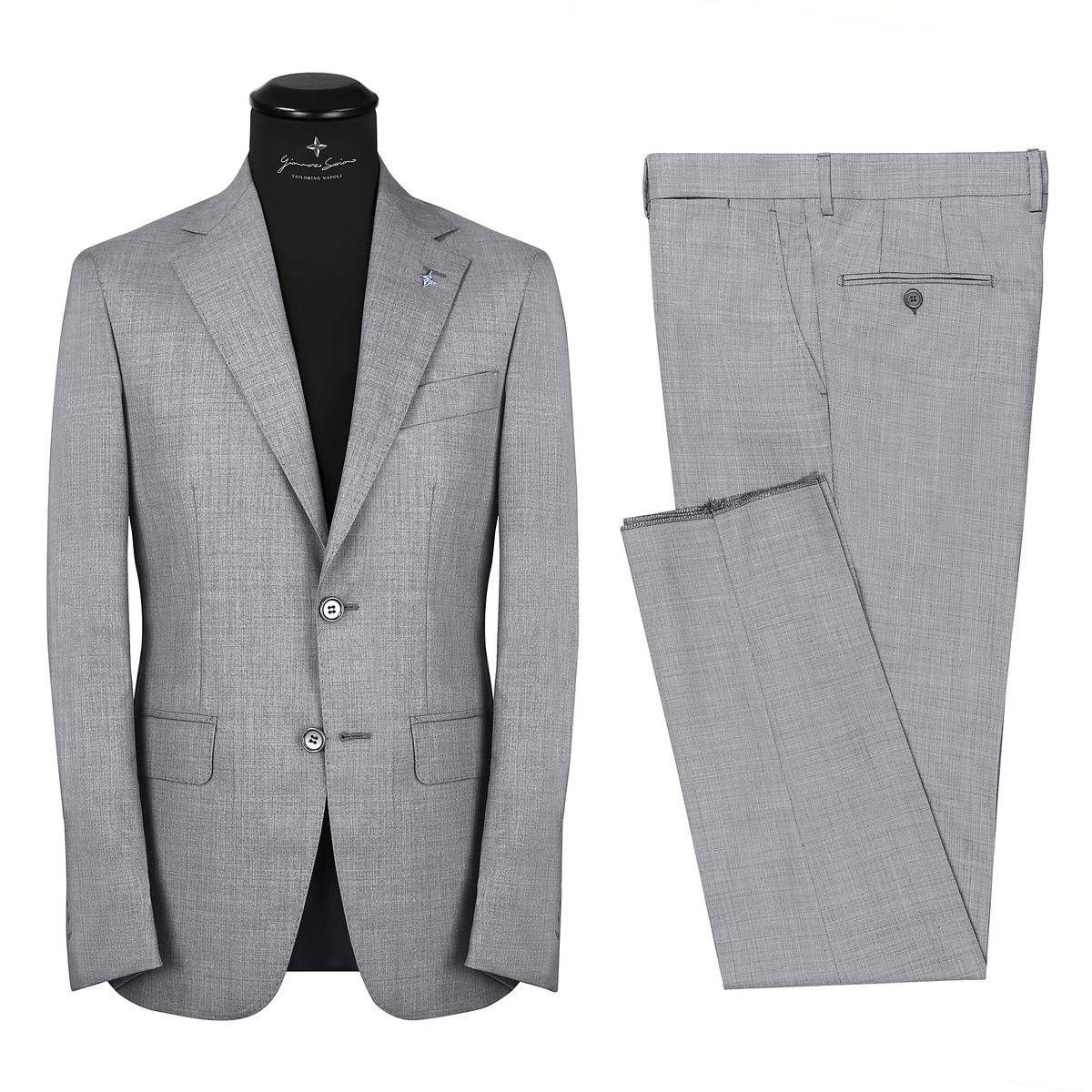 L’abito è realizzato in 2 bottoni, sul davanti è presente il rever classico con sopra la calamita artigianale in ceramica riproducente il logo del brand (possibile da rimuoverla), sul petto c’è il taschino a barchetta tipica forma dell’alta sartoria napoletana, sul retro 2 spacchi per dare maggiore comodità.