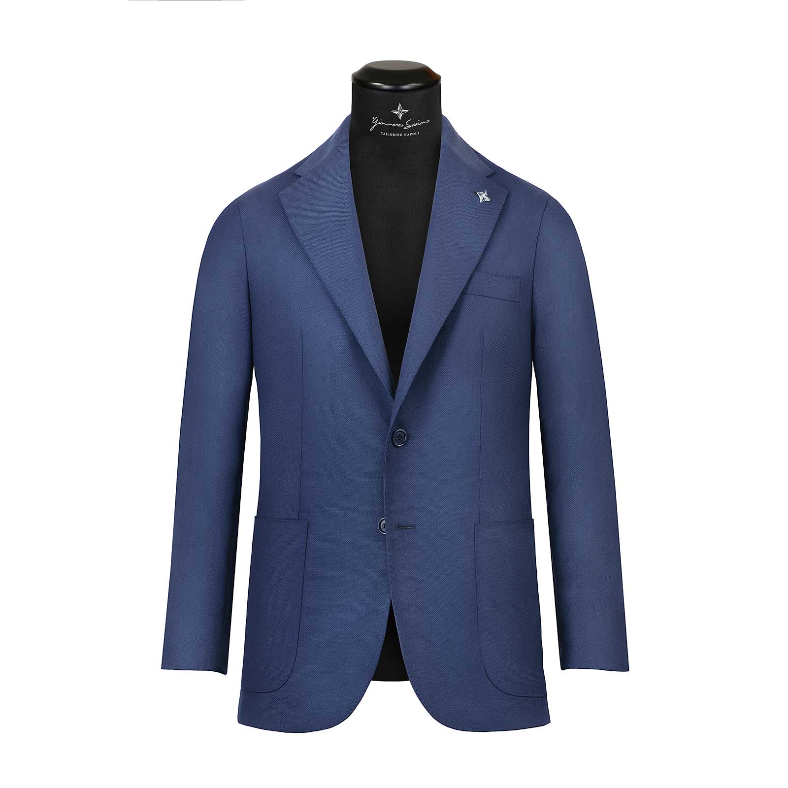 La giacca è realizzato in 3 bottoni stirato 2 bottoni, sul davanti è presente il rever classico con sopra la calamita artigianale in ceramica riproducente il logo del brand (possibile da rimuoverla), sul petto c’è il taschino a barchetta tipica forma dell’alta sartoria napoletana, sul retro 2 spacchi per dare maggiore comodità.