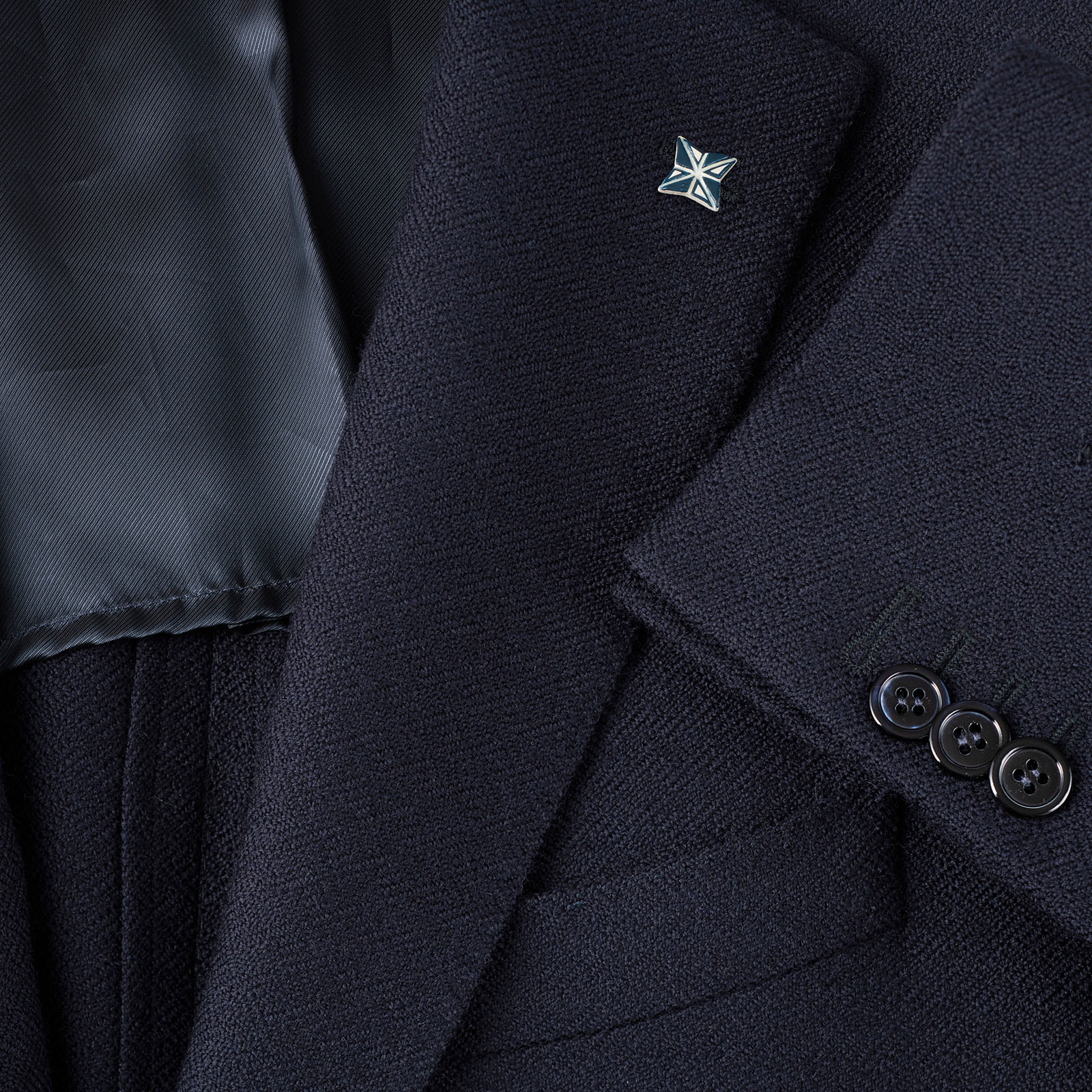 La giacca è realizzato in 2 bottoni, sul davanti è presente il rever a lancia con sopra la calamita artigianale in ceramica riproducente il logo del brand (possibile da rimuoverla), sul petto c’è il taschino a barchetta tipica forma dell’alta sartoria napoletana, sul retro 2 spacchi per dare maggiore comodità.