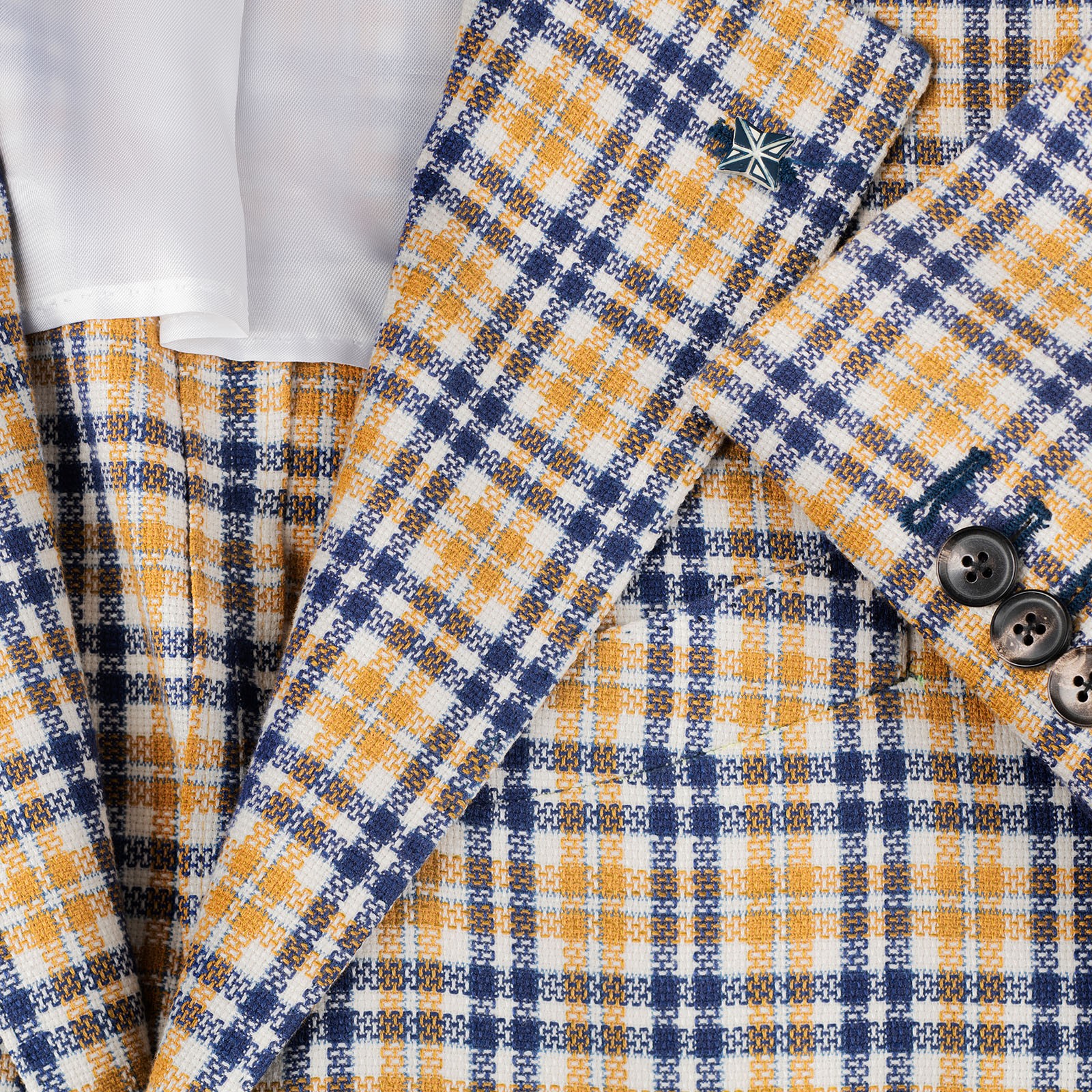La giacca è realizzato in 2 bottoni, sul davanti è presente il rever a lancia con sopra la calamita artigianale in ceramica riproducente il logo del brand (possibile da rimuoverla), sul petto c’è il taschino a barchetta tipica forma dell’alta sartoria napoletana, sul retro 2 spacchi per dare maggiore comodità.