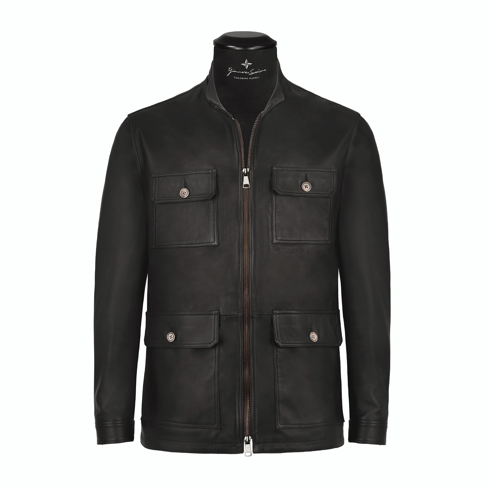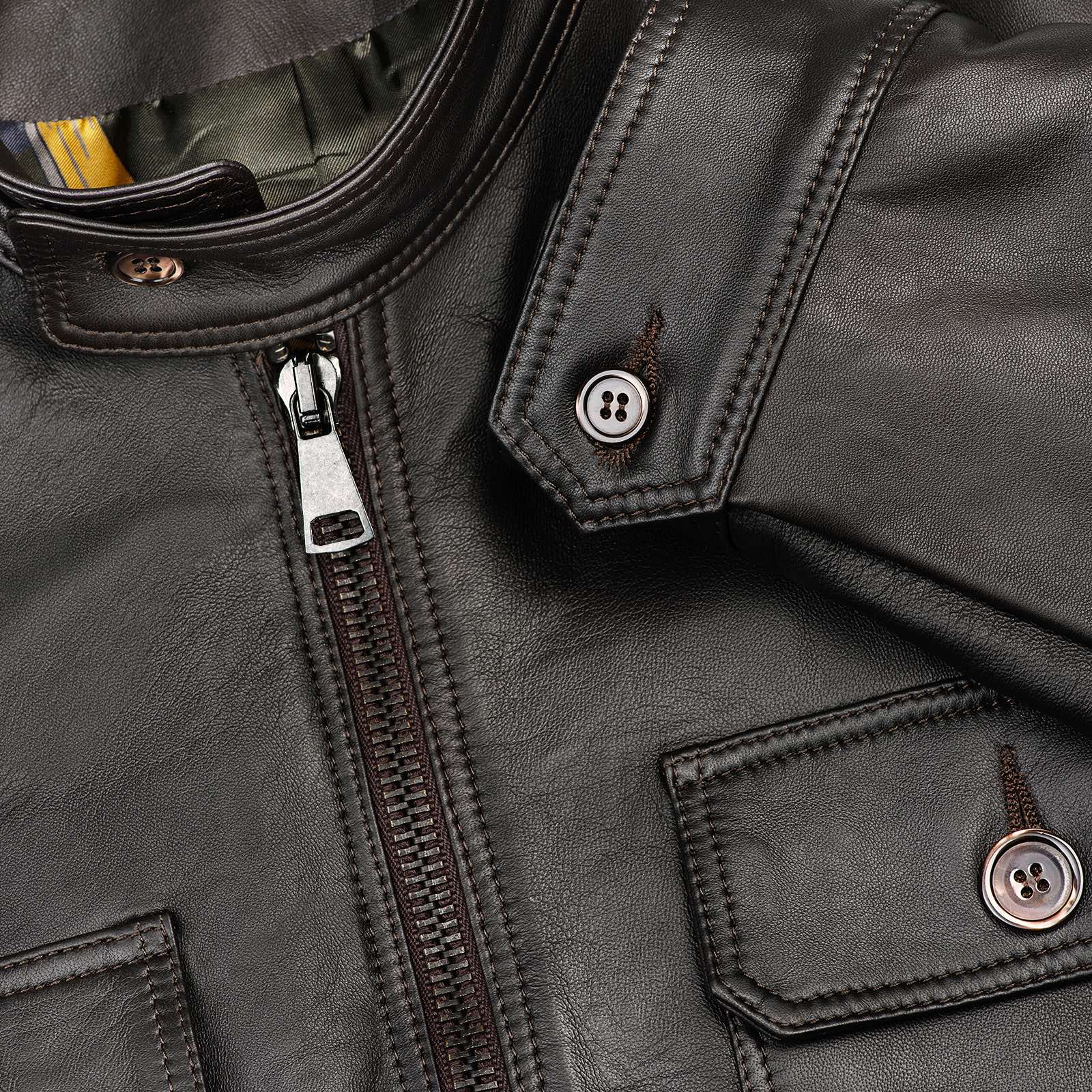 Il giubbino in pelle artigianale è realizzato con il collo a pistagna con chiusura in bottone madreperla, la chiusura frontale è dato dalla cerniera con doppio cursore super scorrevole una delle migliori sul mercato, un’altro particolare di unicità e qualità assoluta è dato dalla fodera interna personalizzabile che è interamente in seta bemberg, (durante l’acquisto, si ha la possibilità di poter scegliere la fodera che più si preferisce tra varie opzione di design esclusivi). I polsini hanno la chiusura regolabile da 2 bottoni in madreperla, sul davanti ci sono 4 tasche con chiusura con pattina in bottoni madreperla.