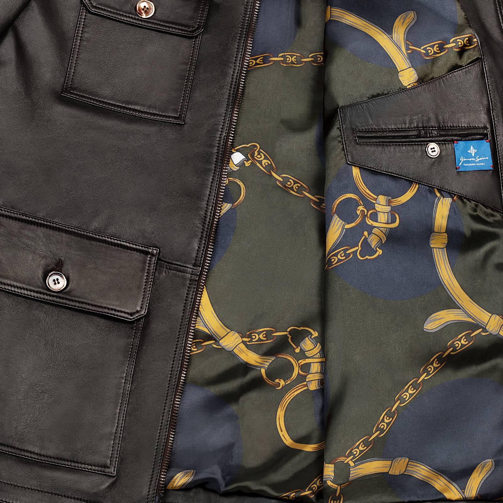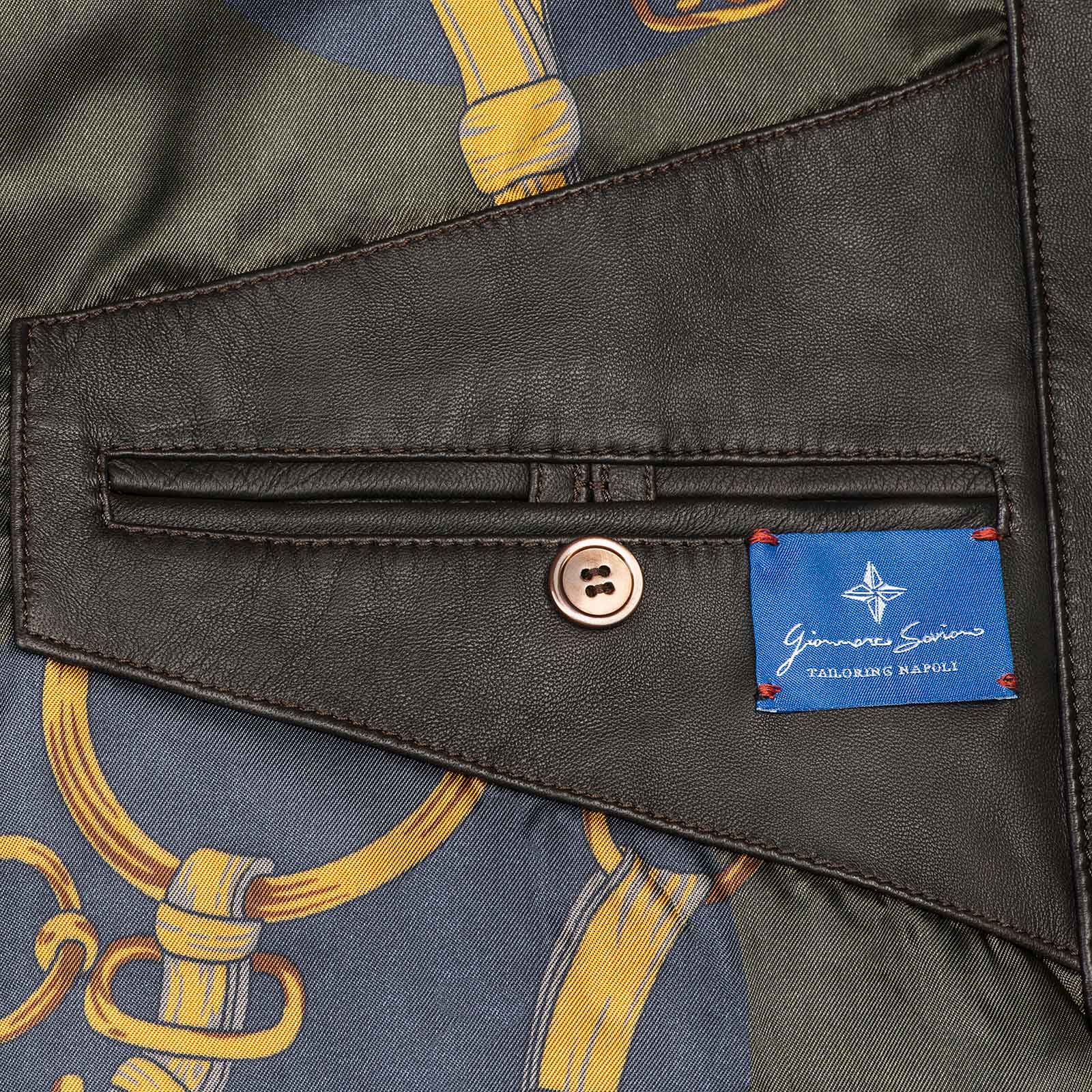 Il giubbino in pelle artigianale è realizzato con il collo, orlo e polsini in maglia dal tessuto lana e cashmere, la chiusura frontale è dato dai bottoni in corno, un’altro particolare di unicità e qualità assoluta è dato dalla fodera interna personalizzabile che è interamente in seta bemberg, (durante l’acquisto, si ha la possibilità di poter scegliere la fodera che più si preferisce tra varie opzione di design esclusivi). Sul davanti ci sono 2 tasche con pattina con chiusura in bottoni madreperla e sui laterali ci sono 2 tasche con chiusura a pressione.