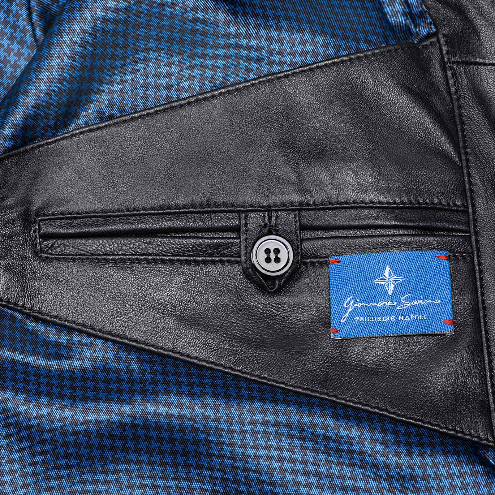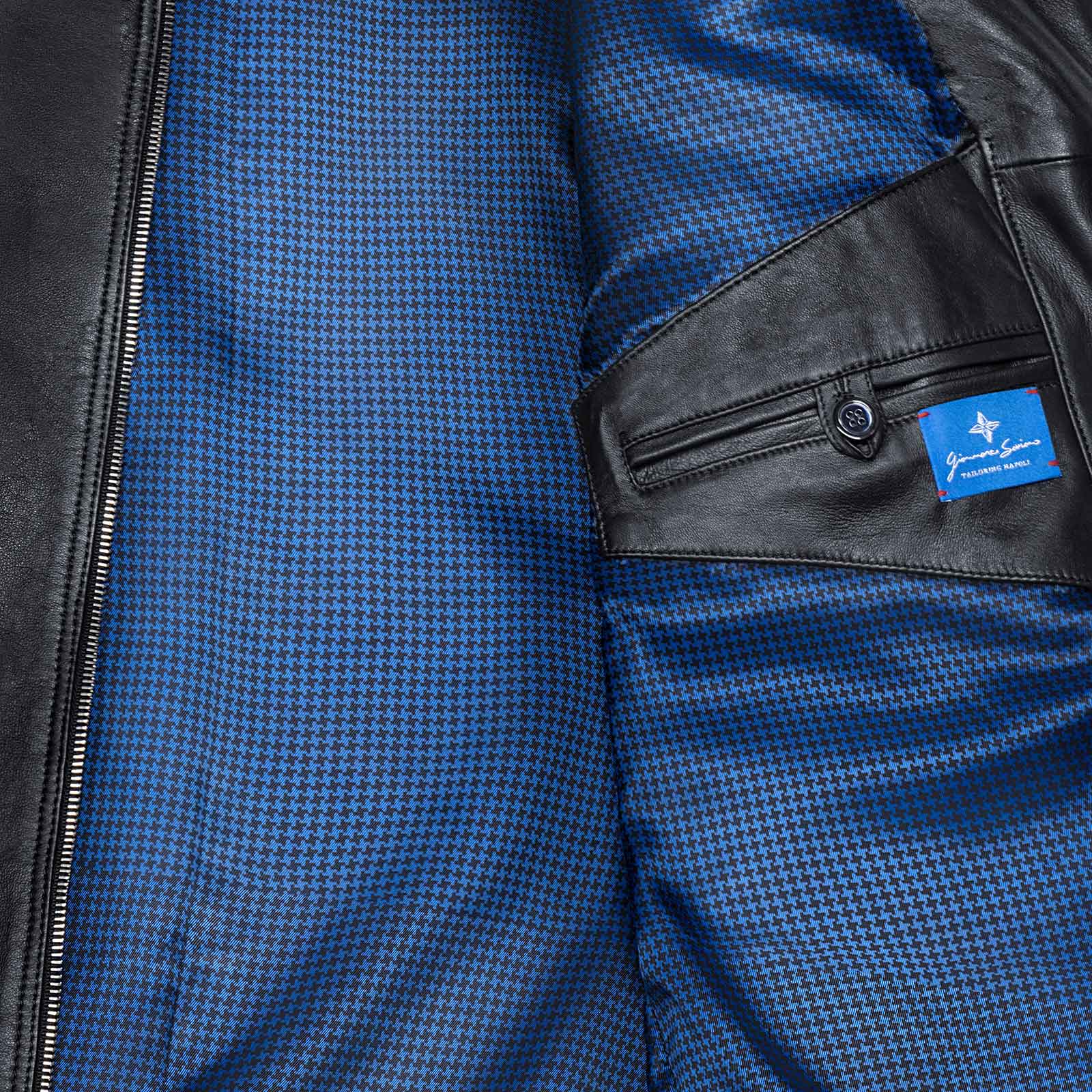 Il giubbino in pelle artigianale è realizzato con il collo, orlo e polsini in maglia dal tessuto lana e cashmere, la chiusura frontale è dato dai bottoni in corno, un’altro particolare di unicità e qualità assoluta è dato dalla fodera interna personalizzabile che è interamente in seta bemberg, (durante l’acquisto, si ha la possibilità di poter scegliere la fodera che più si preferisce tra varie opzione di design esclusivi). Sul davanti ci sono 2 tasche con pattina con chiusura in bottoni madreperla e sui laterali ci sono 2 tasche con chiusura a pressione.