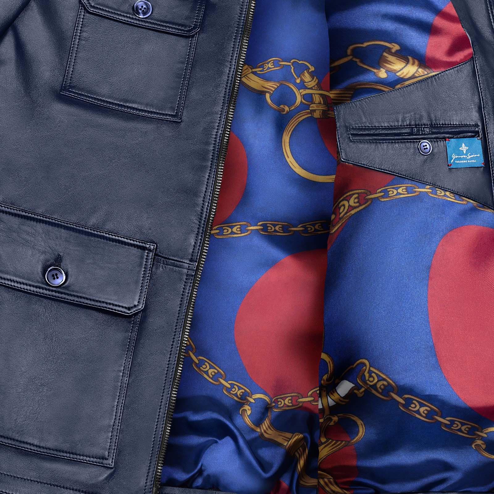 Il giubbino in pelle artigianale è realizzato con il collo a pistagna con chiusura in bottone madreperla, la chiusura frontale è dato dalla cerniera con doppio cursore super scorrevole una delle migliori sul mercato, un’altro particolare di unicità e qualità assoluta è dato dalla fodera interna personalizzabile che è interamente in seta bemberg, (durante l’acquisto, si ha la possibilità di poter scegliere la fodera che più si preferisce tra varie opzione di design esclusivi). Sui laterali ci sono 2 tasche con chiusura a cerniera.