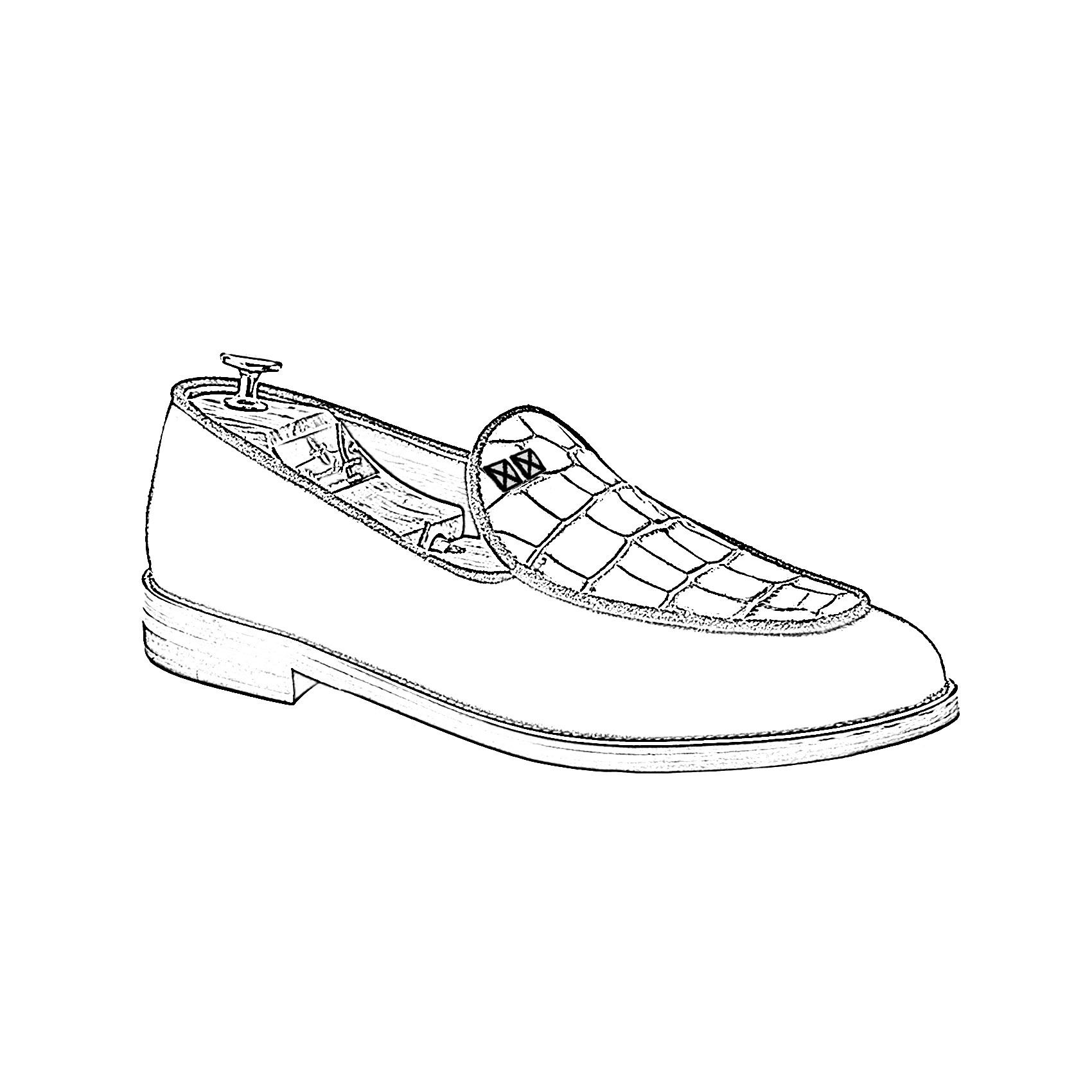Il mocassino è realizzato sulla parte superiore con il contrasto di pelle lavorata in coccodrillo, il tacco in antiscivolo vero cuoio è alto 3 cm: altezza ritenuta ideale dagli esperti per una corretta deambulazione, il guardolo anch’esso in vero cuoio.