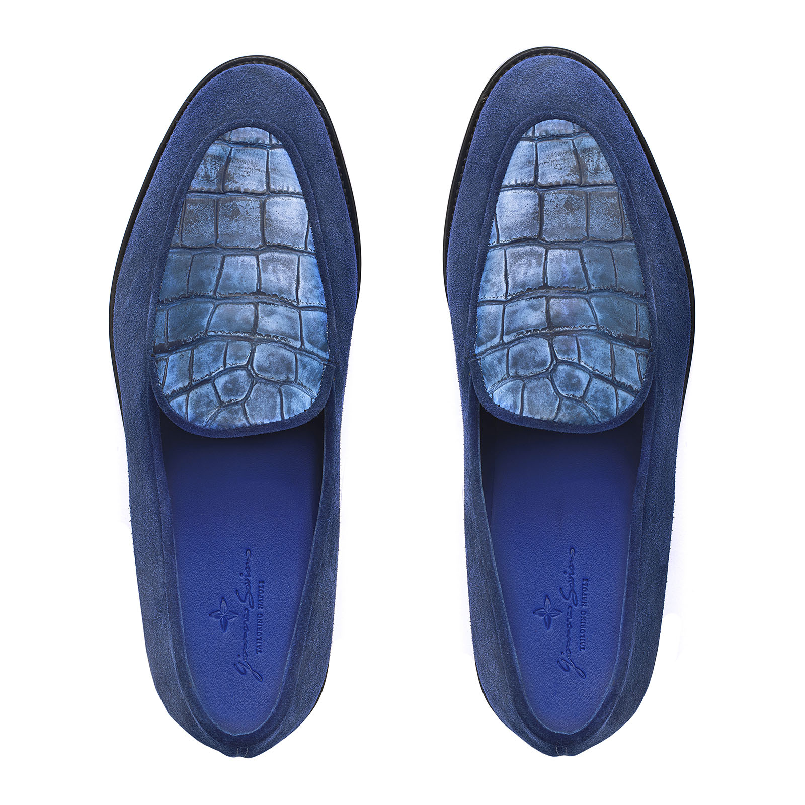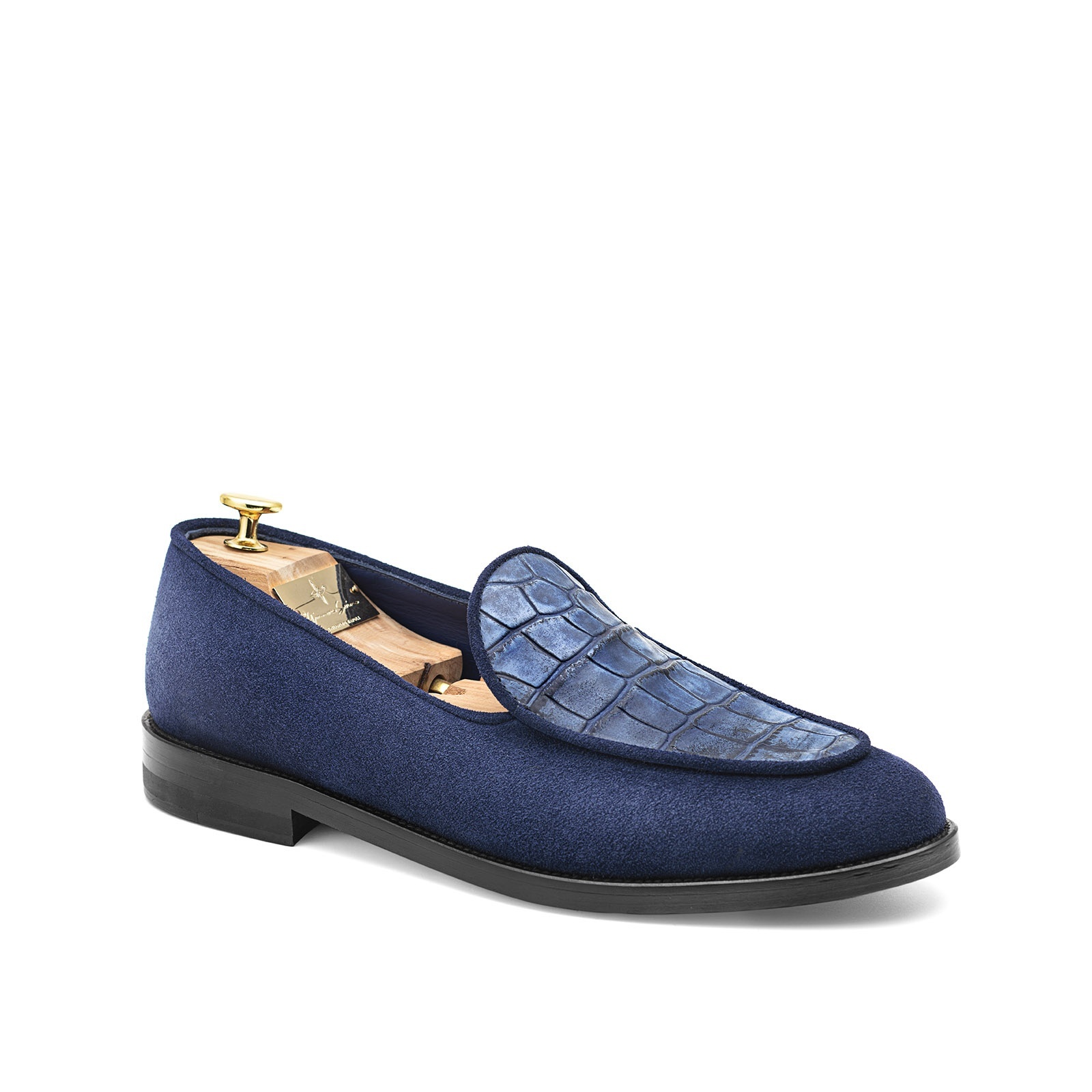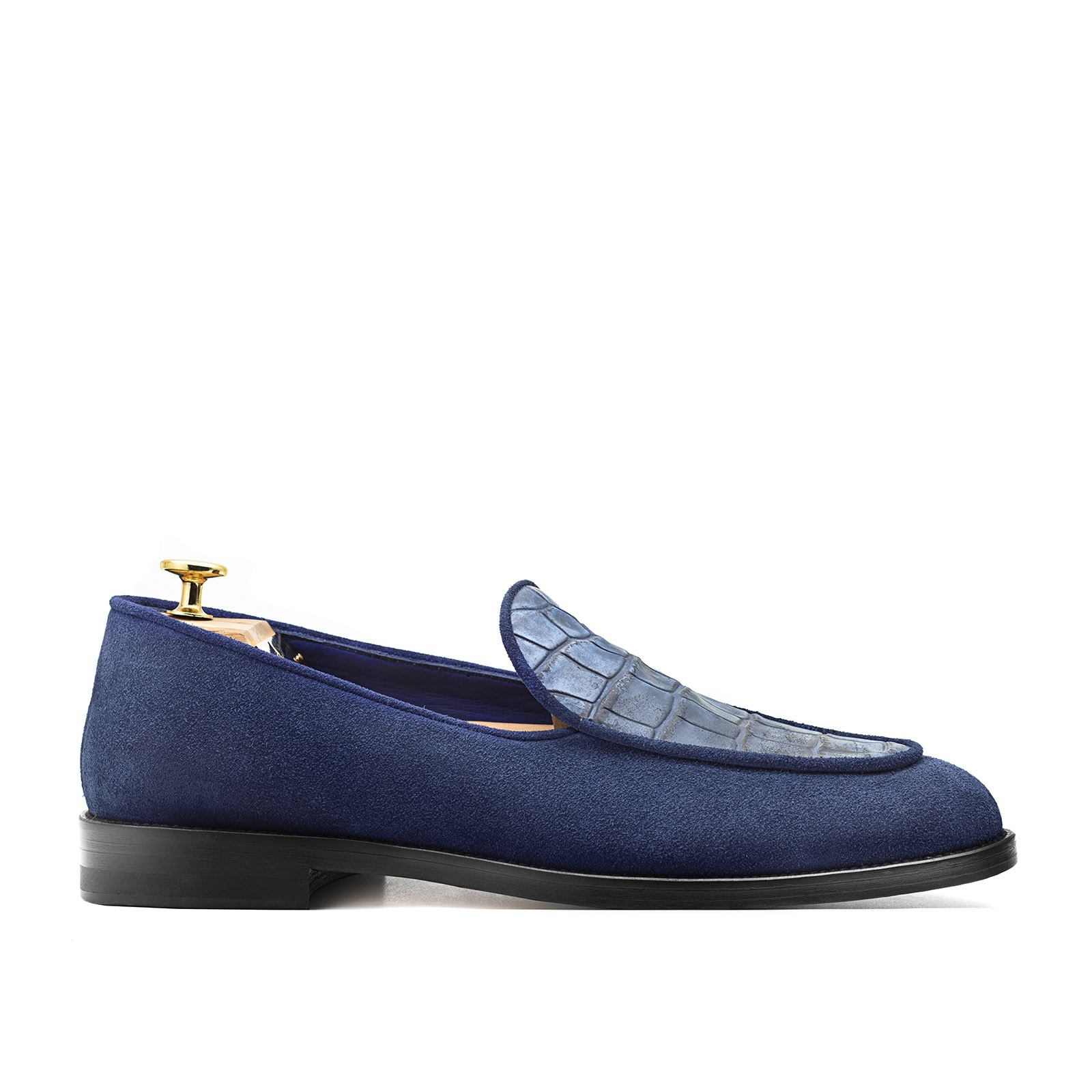 Pellame 100% scamosciata blu parte inferiore e Pellame 100% lavorazione coccodrillo blu parte superiore – fodera interna 100% Capra blu - Lavorazione