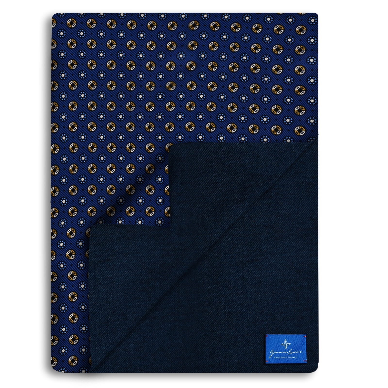 Realizzata in tessuto seta il lato su cui è presente la fantasia mentre in tessuto lana di alta qualità il lato su cui è presente la tinta monocromatica.